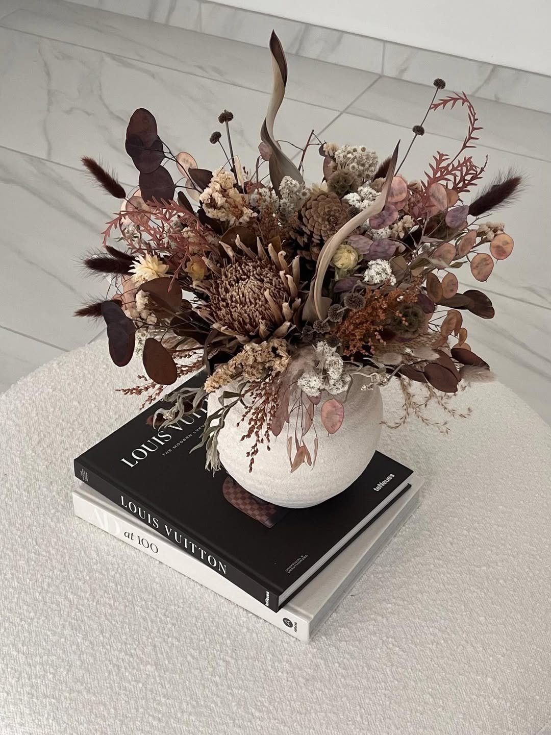 A rich, autumnal-inspired dried floral arrangement featuring a focal King Protea, professionally styled in a bespoke white textured stone vase for permanent, maintenance-free home elegance.